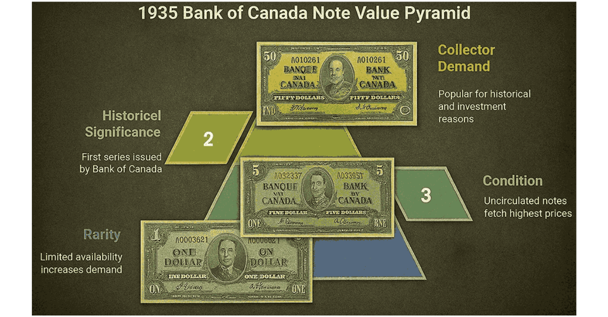 The 1935 Bank of Canada Notes have increased in value over the decades because of rarity, condition and historical significance. Uncirculated or near mint notes are the most expensive and still, circulated notes have considerable value to the collectors. With fewer clean notes floating in the market, demand is on the increase which gives the strong appreciation in the long term.