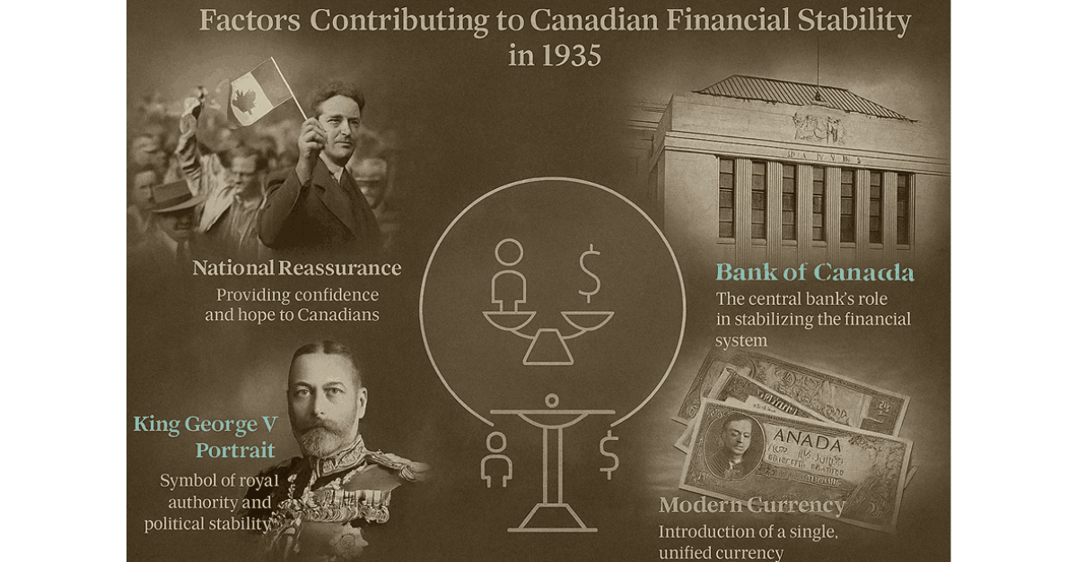 The portrait of King George V represented the Royal authority and stability in politics. The series was more than money but it was an instrument of national reassurance, which was a symbol of stability, hope and a new dawn in Canadian finance. These notes were strong cultural and economic symbols because its imagery brought confidence to Canadians when they needed it the most.