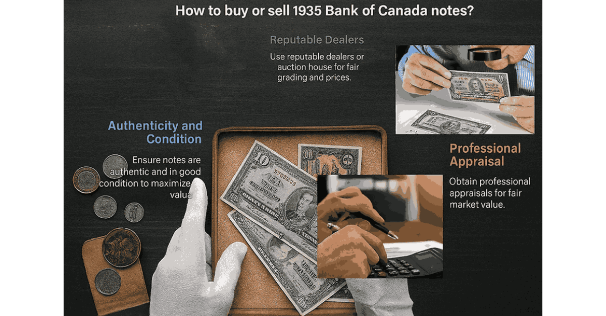 The sale or buying of 1935 Bank of Canada Notes notes should be done with a lot of care on authenticity and condition. The most expensive are the uncirculated or near mint notes and worn notes are not totally useless. The dealers or auction houses dealing with numismatics should always be reputable. This guarantees you correct grading, reasonable prices and counterfeit safeguarding.