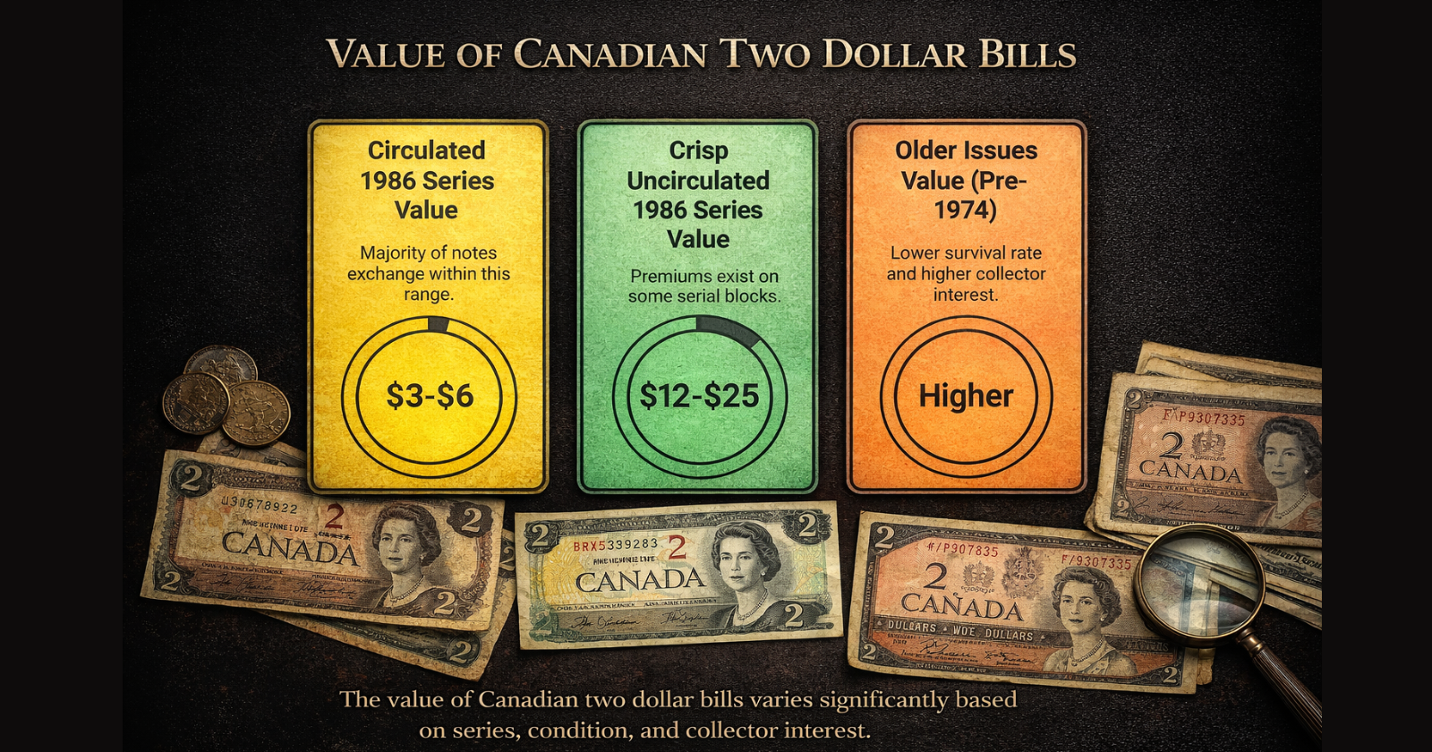 The variable that is the most influential is condition. Even when the difference is intangible, a note that has been graded as about uncirculated can outdo a very fine specimen by several folds. This is the reason why most individuals prefer to get their Bank of Canada two dollar bills assessed by professionals instead of depending on the pictures shown online or unprofessional guesses.