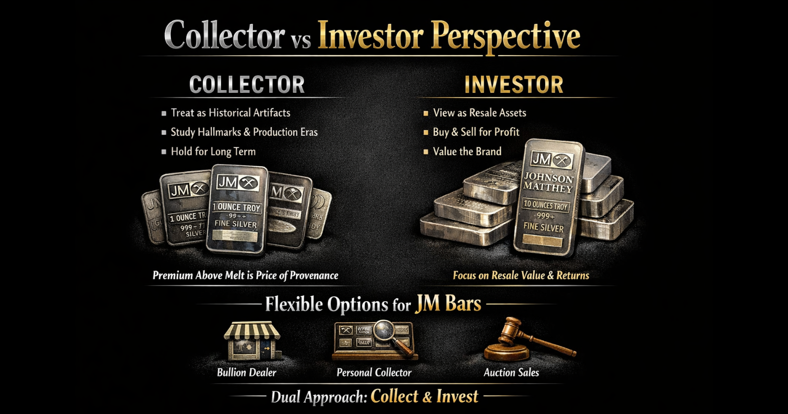 Collectors treat JM bars as historical objects. They study the hallmark changes, target specific intervals of production and keep bars on a long term basis with little consideration of the daily spot prices. The value above melt is to a collector the cost of ownership of something of genuine provenance.