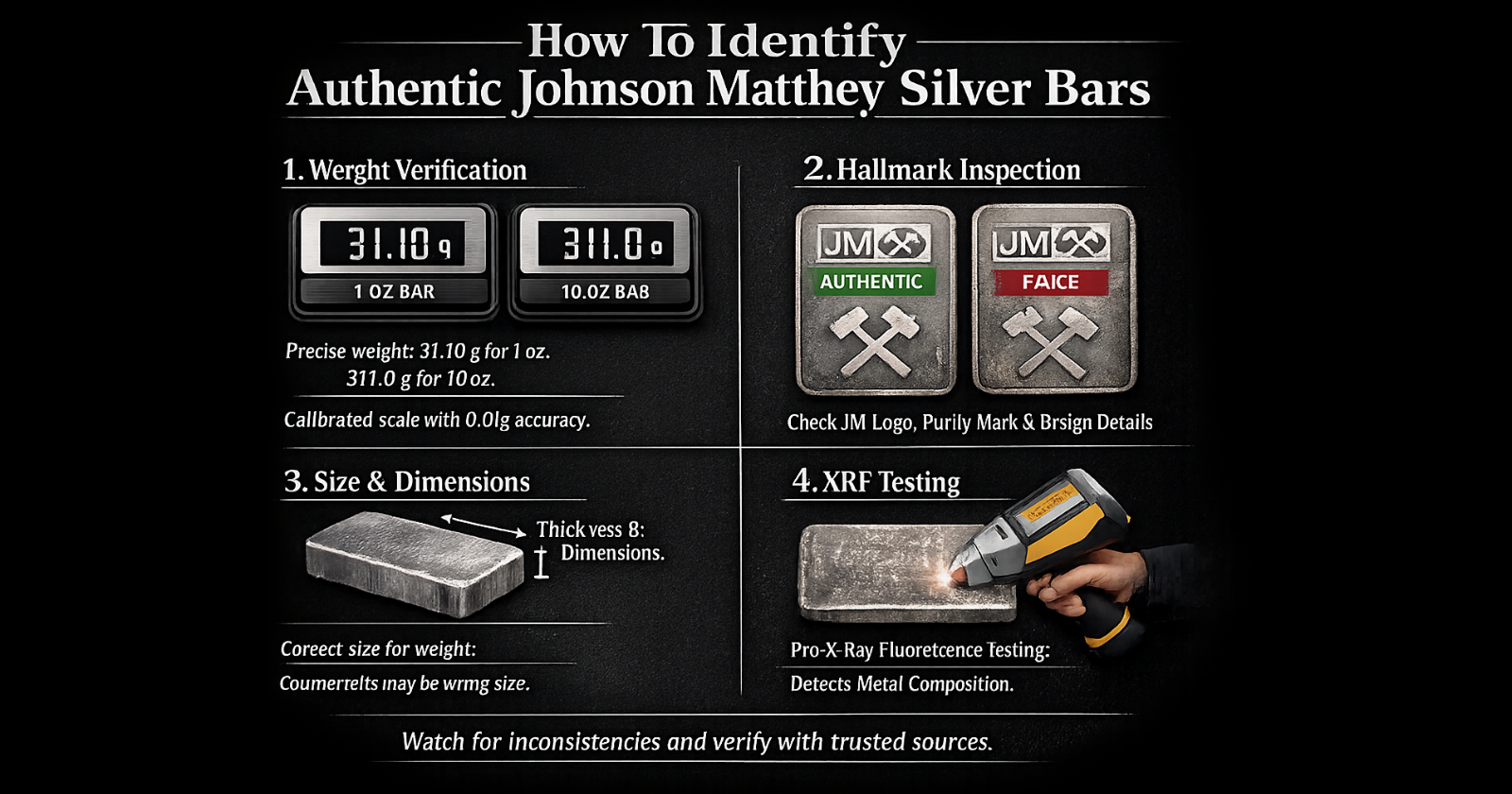 Ans. Check weight first (31.10 g for 1 oz; 311.0 g for 10 oz). Examine the JM hallmark for clean, consistent stamping. Compare against confirmed authentic examples. Use calipers to verify dimensions. For significant purchases, request XRF testing from a reputable dealer or assay service.