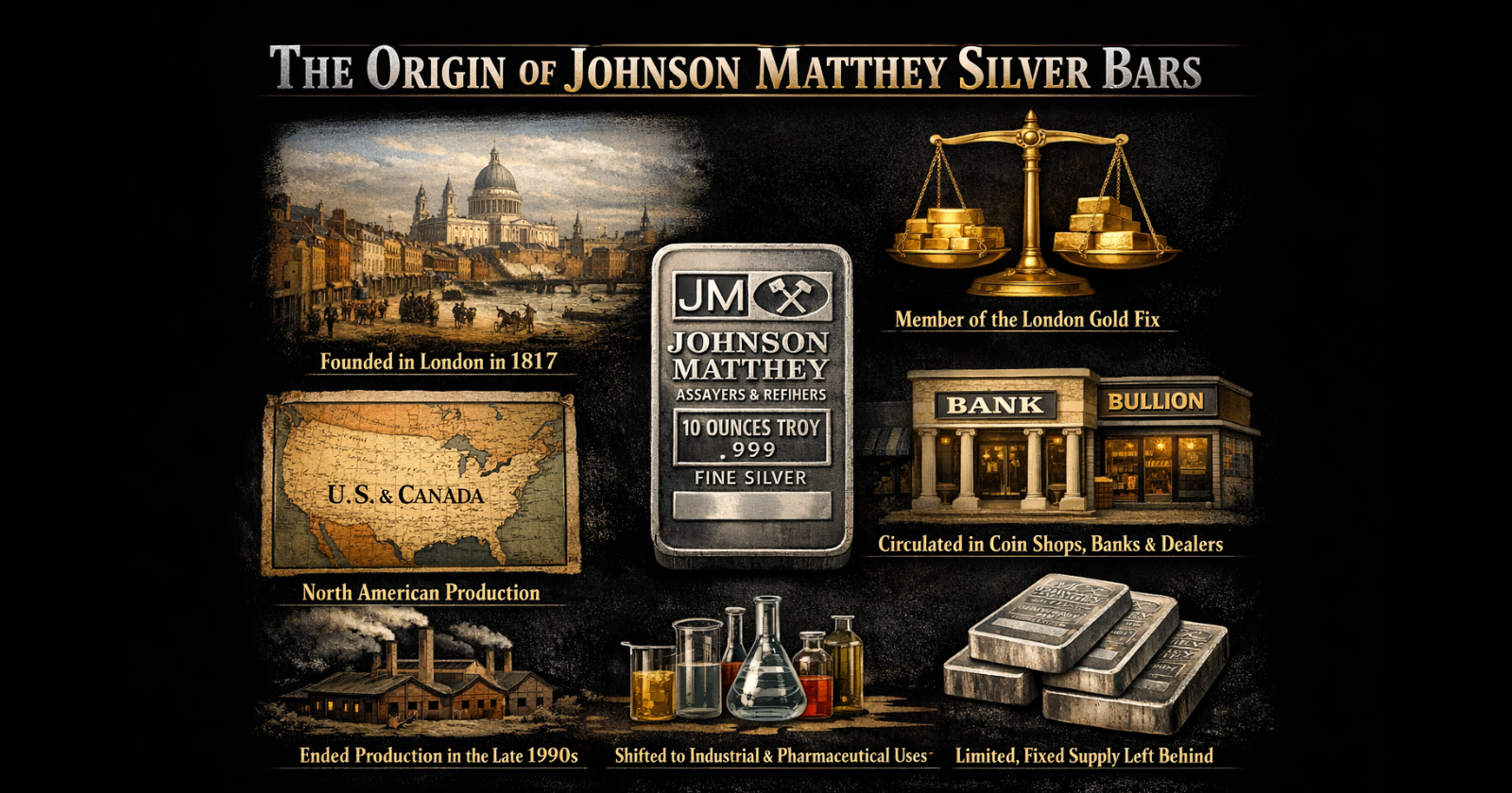 JM bars were minted in North American operations, which circulated through the coin shops, banks, and bullion dealers in Canada and the United States, and when the company restructured and discontinued the silver bar operation, it left a fixed supply that was not being replenished.