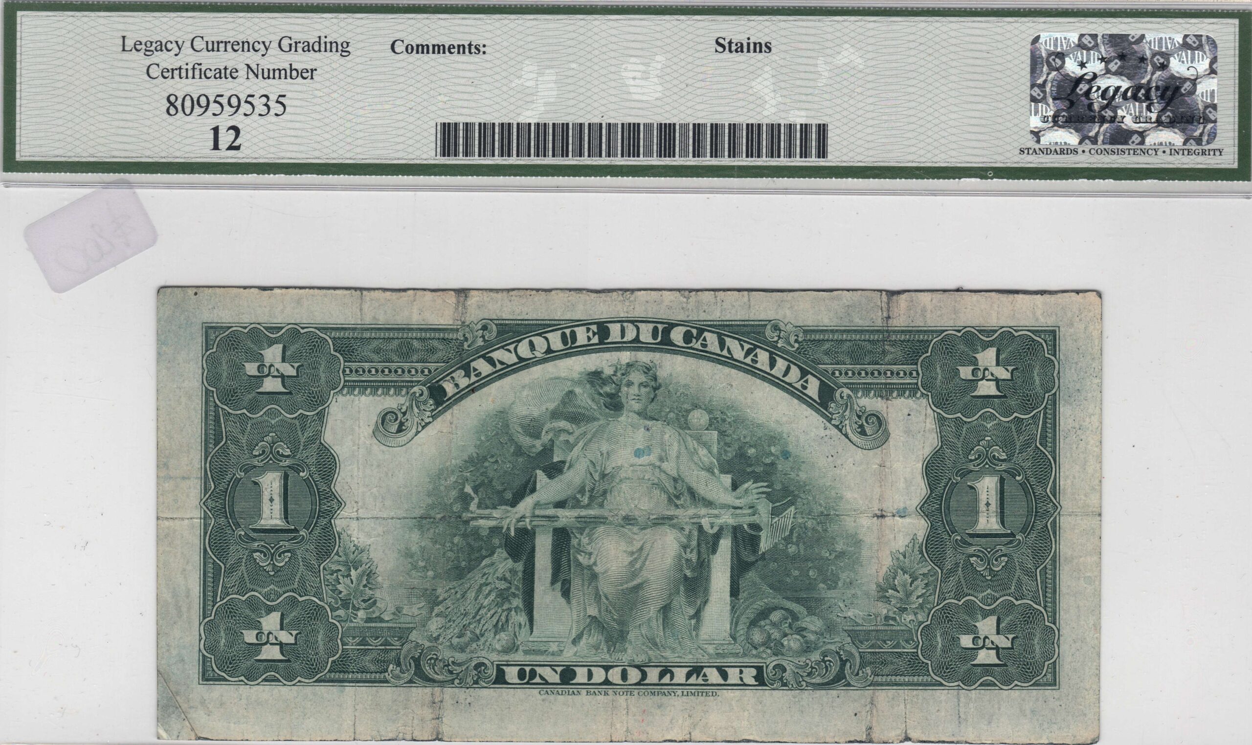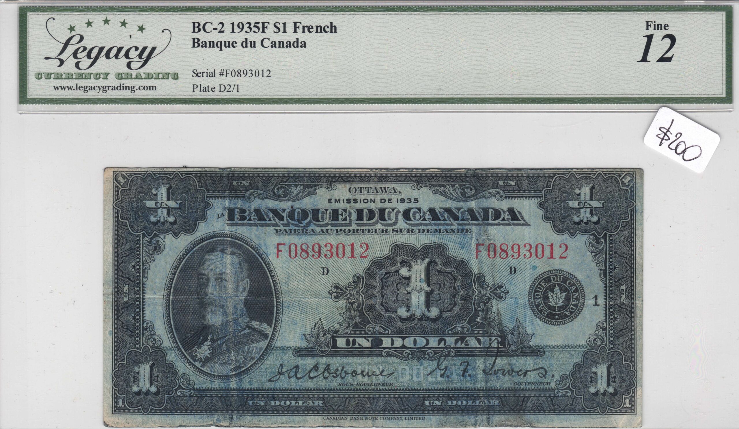 The 1935F Bank of Canada $1 bill, BC-2 French version, features the Osborne-Towers signatures and showcases the elegant green design typical of the period. Graded Fine 12, it exhibits moderate wear with visible folds and some softening but remains complete and intact. This note is an important example of early bilingual Canadian currency, specifically the French-language version. Collectors value it for its historical significance, detailed engraving, and role in Canada’s banking history.