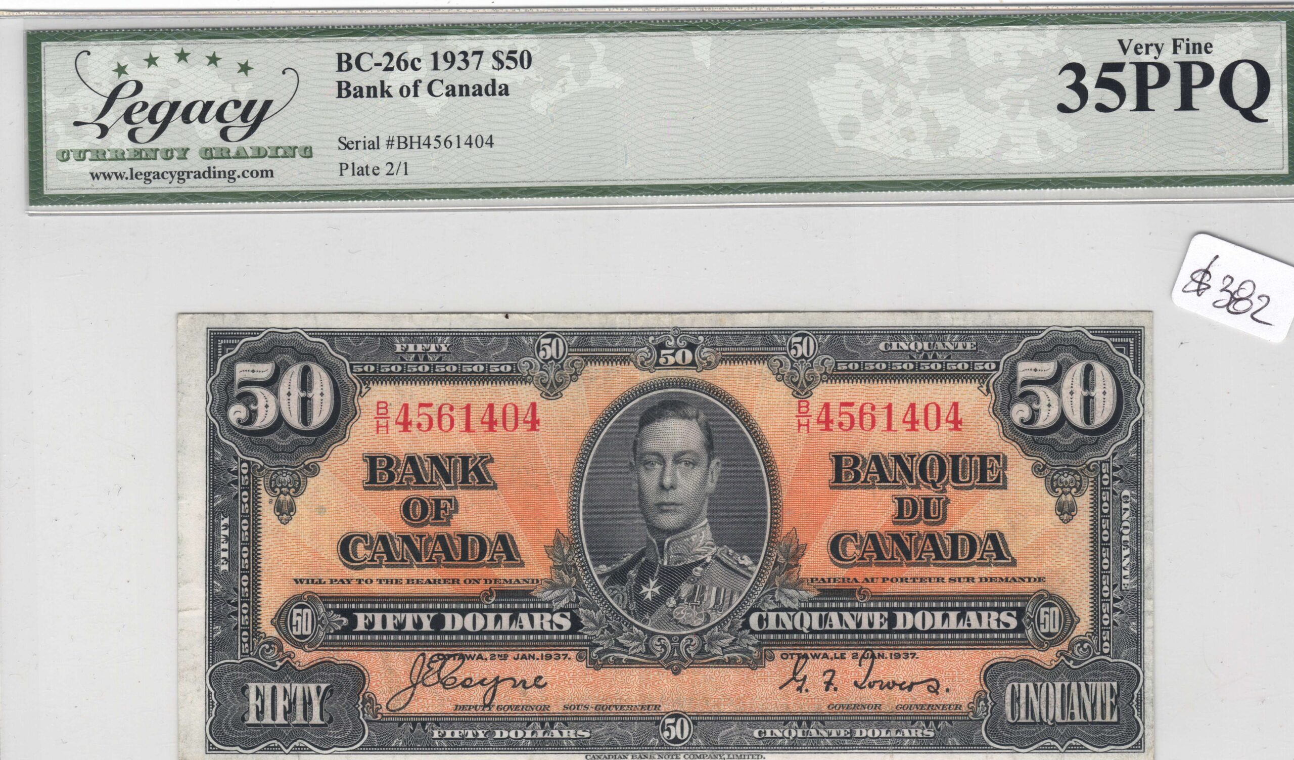 A 1937 Bank of Canada $50 bill (BC-26c) graded Very Fine 35PPQ is a well-preserved example of Canada’s historical currency. The Very Fine 35 grade indicates moderate circulation with some signs of wear, while PPQ (Premium Paper Quality) means the note retains its original paper integrity without any cleaning or pressing. Featuring the Osborne-Towers signatures and a distinctive red tint, this note reflects the design and craftsmanship of the era. It remains a sought-after piece for collectors appreciating early Canadian banknotes.