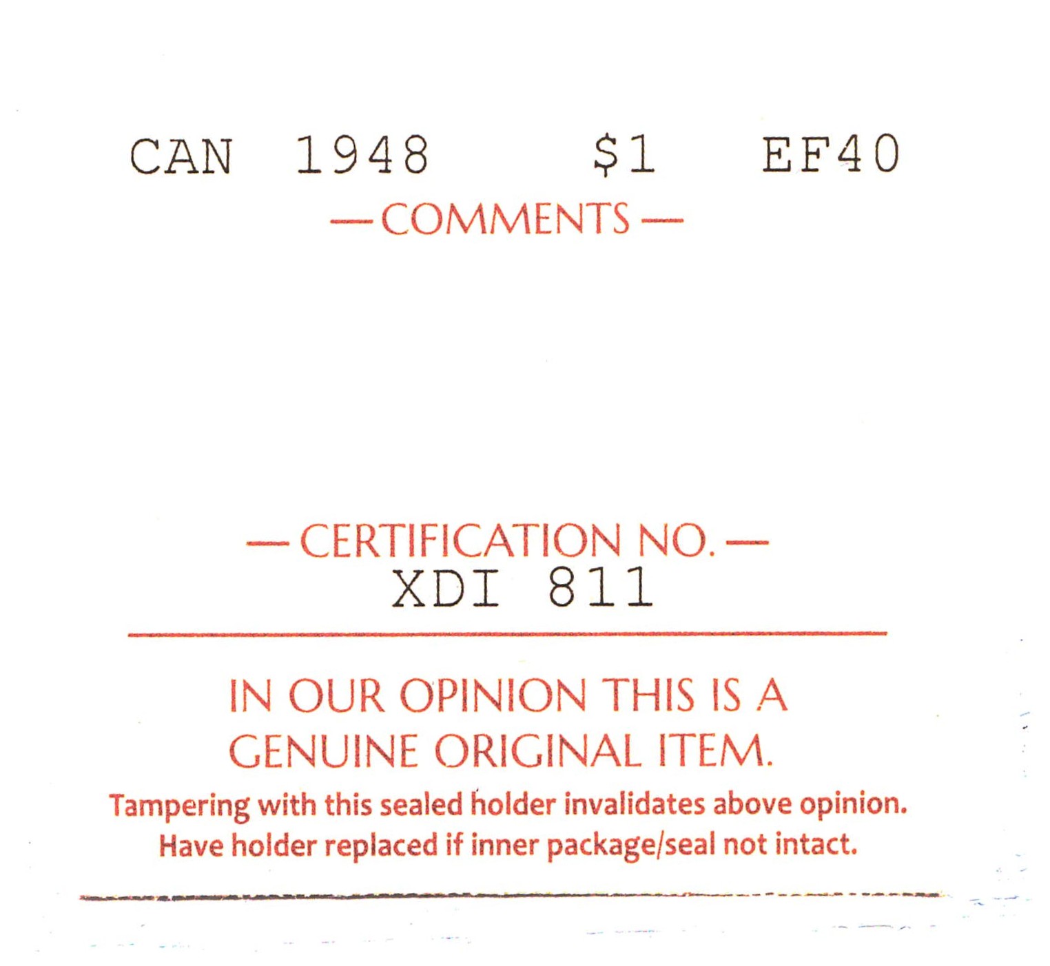 The 1948 ICCS Graded Canadian \$1 EF-40 Silver Coin is a beautiful example of Canadian numismatic history. Struck in 80% silver, this coin features the iconic caribou design on the reverse and the portrait of King George VI on the obverse. Graded EF-40 (Extremely Fine) by the International Coin Certification Service (ICCS), it shows only light wear from circulation, with all key features clearly visible and well-defined. The EF-40 grade indicates the coin is in excellent condition for its age, making it highly sought after by collectors. Its rarity, historical significance, and ICCS certification ensure it’s a valuable addition to any collection or investment portfolio.